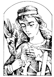 Atribúty: zlomené koleso, kniha, meč, koruna