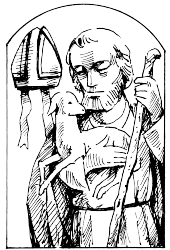 Atribúty: zobrazený v pastierskom rúchu s palicou v ruke, s biskupskými insígniami a nožom