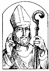 Atribúty: biskupská mitra, berla, kniha