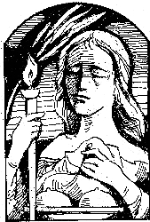 Atribúty: fakľa, sviečka, ľalia, palma, odrezané prsia na tácke